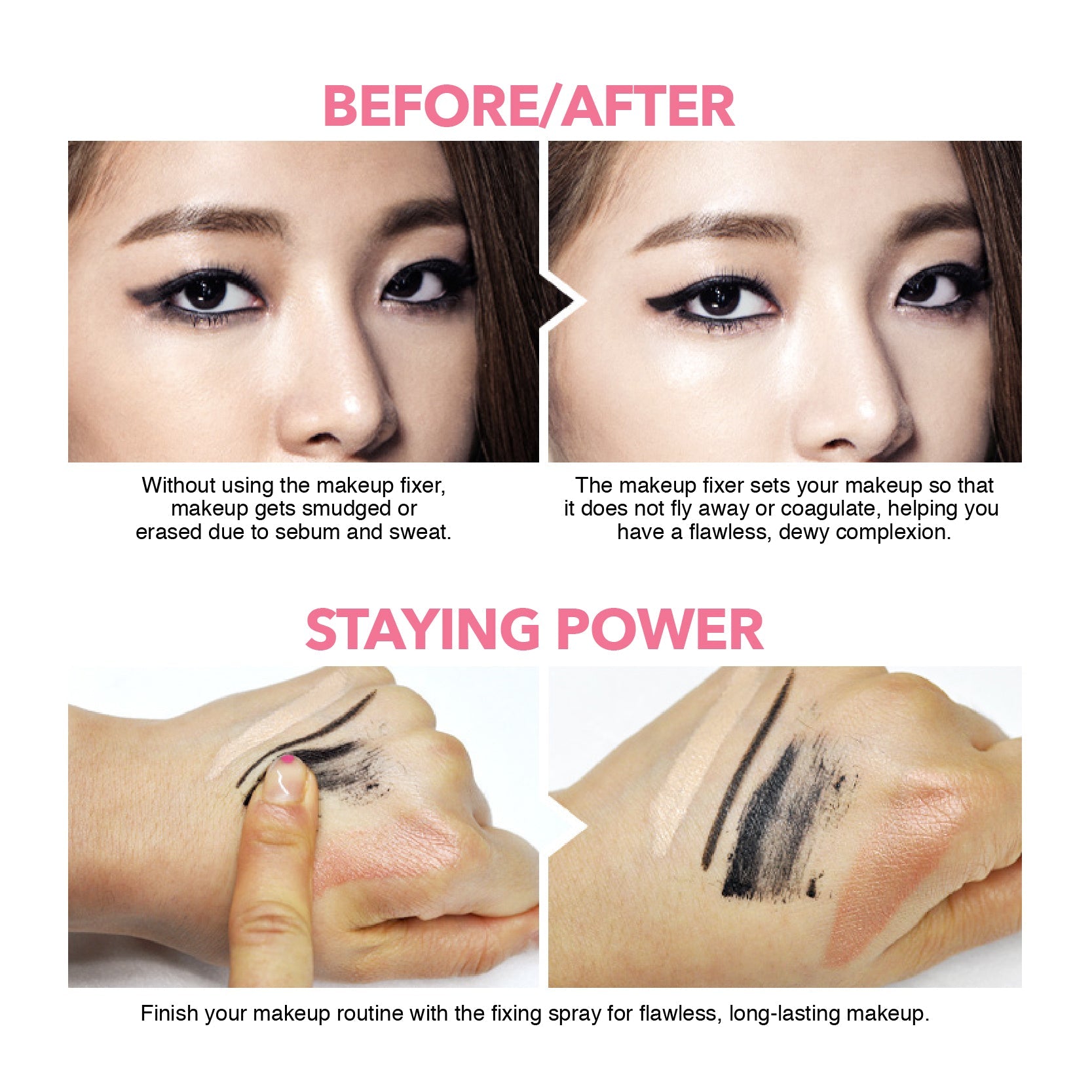 Stop your makeup from smudging and clumping throughout the day. The super fine and even mist will keep you looking fresh with no need to touch up during the day. This makeup fixer was ranked #1 by K-Beauty professionals on “Get It Beauty” in a blind test. Not only does the FIXX keep you looking great and vibrant, it hydrates and nourishes your skin with lemon, tea tree, and centella asiatica extract. The finishing touch is the fresh floral scent. Great for all skin types. Apply before makeup application to smooth skin texture and boost adhesion. Apply after makeup to boost longevity and fixability of completed makeup.